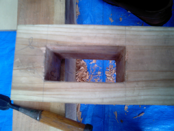 柱の上部にある「ほぞ」が上に載る桁、梁を貫通するのですが、今作っている桁のほぞ穴に苦戦しております。