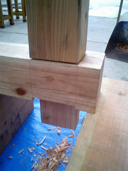 柱の上部のほぞをほぞ穴にはめ、しっかりとはまるように削って調整していきます。