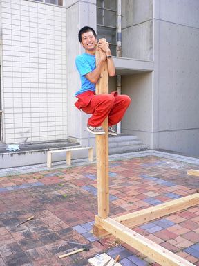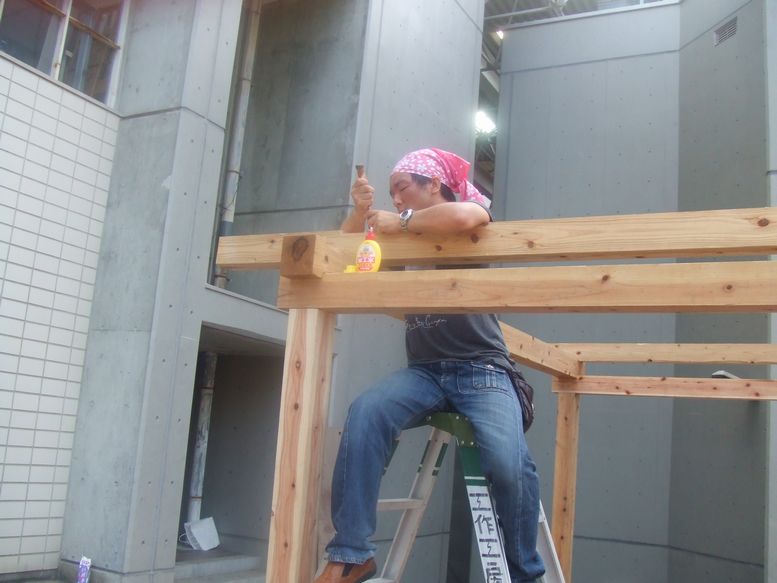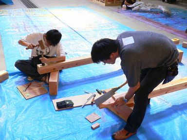 柱のほぞが太すぎたので修正もしました(写真右・犬山がやってます)
